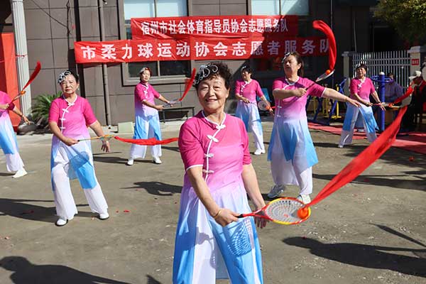 10月20日,市柔力球運(yùn)動(dòng)協(xié)會(huì)會(huì)員在展演柔力球。重陽(yáng)節(jié)即將來(lái)臨,市柔力球運(yùn)動(dòng)協(xié)會(huì)、埇橋區(qū)老年大學(xué)組織會(huì)員、學(xué)員走進(jìn)蓮花老年頤養(yǎng)中心,開(kāi)展慰問(wèn)演出?;顒?dòng)現(xiàn)場(chǎng),柔力球、舞蹈、葫蘆絲、豫劇等精彩節(jié)目輪番上演,贏得了老人的陣陣掌聲。 特約攝影 劉中玉