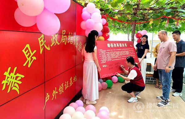 8月9日上午,3對(duì)青年在蕭縣民政局頒證師的見證下,領(lǐng)取結(jié)婚證。近年來,蕭縣通過舉辦集體婚禮、頒證師見證、簽訂婚事新辦協(xié)議等,倡導(dǎo)婚俗改革,培育文明新風(fēng)。 特約攝影 李鵬